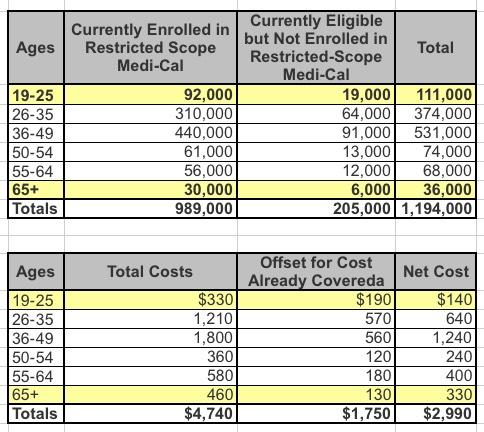 On the surface, those per-enrollee costs seem extremely low; Medicaid in California actually averaged around $1,800 for working-age adults and nearly $11,000 for seniors back in 2014, and has increased around 6-7% since then (call it $1,950 and $11,500 respectively today).