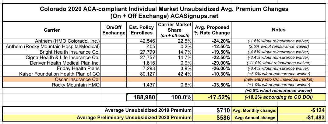 Colorado: Preliminary avg. 2020 #ACA exchange premiums: 18.2% *decrease* with reinsurance, 0.5% increase without it