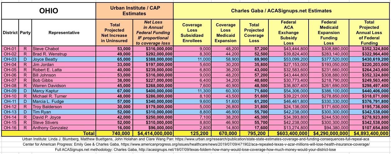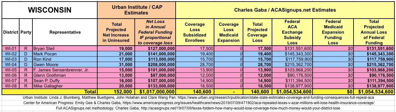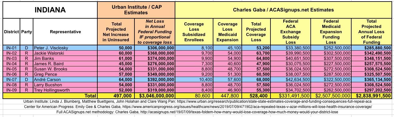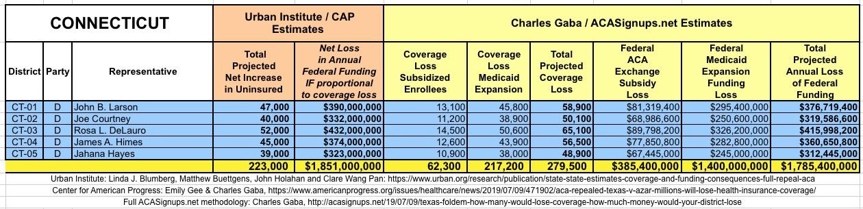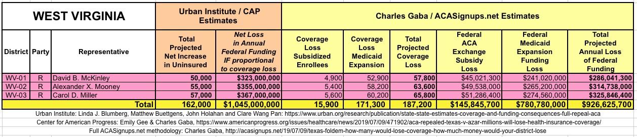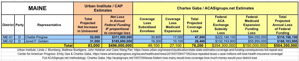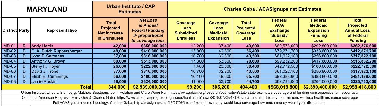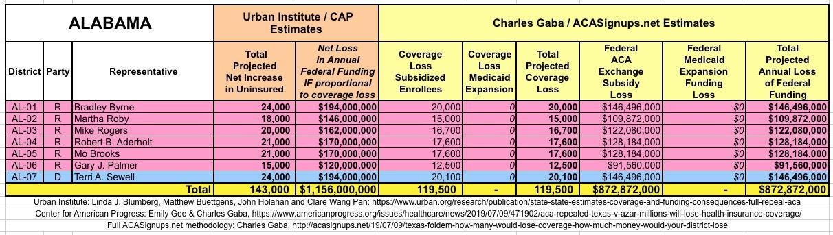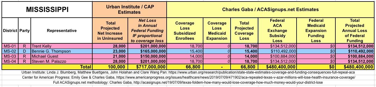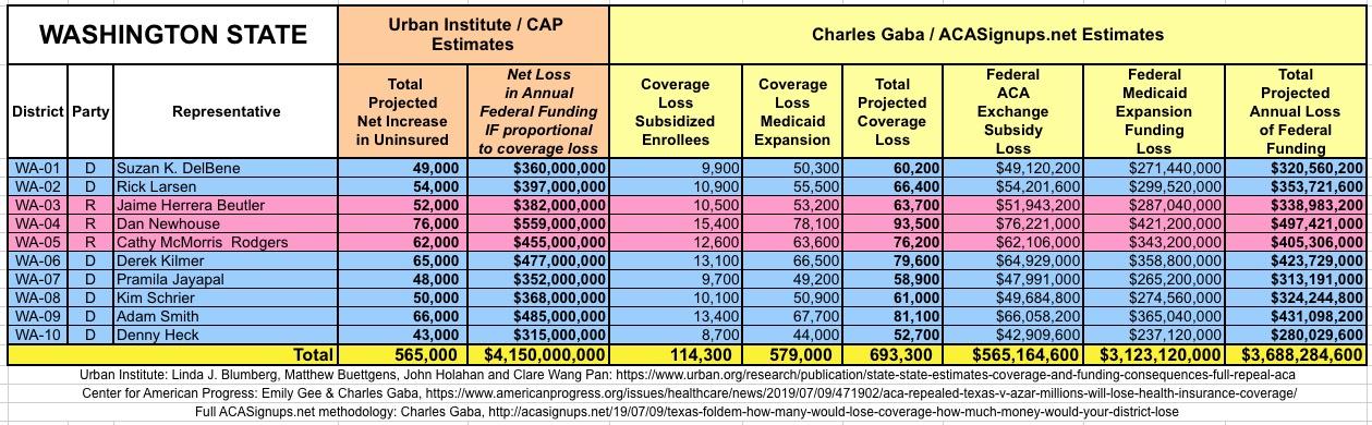 The Urban/CAP numbers are probably more accurate, but mine have one advantage: I've broken out both the coverage losses and funding losses by category (Individual Exchange Market/BHP and Medicaid Expansion). In addition, I've color-coded the Congressional Districts by which party each U.S. Representative is a member of.