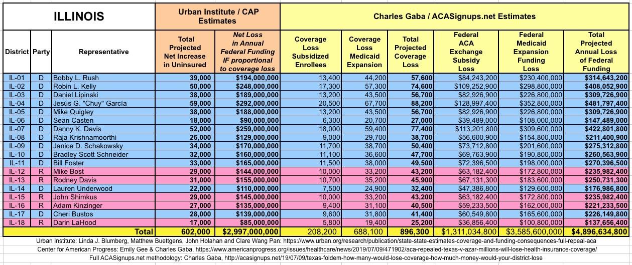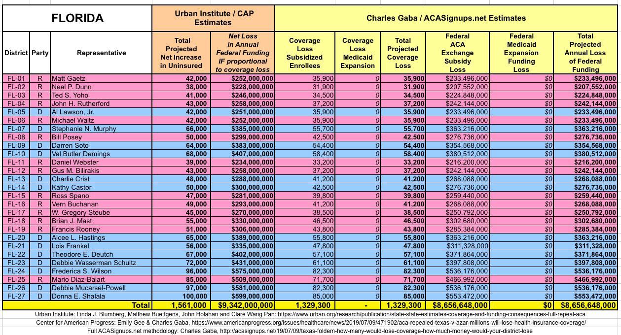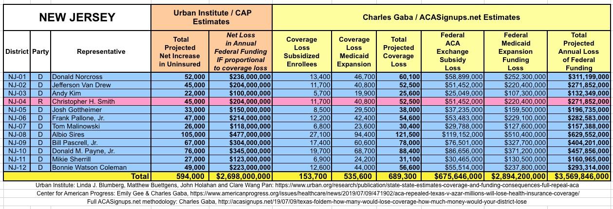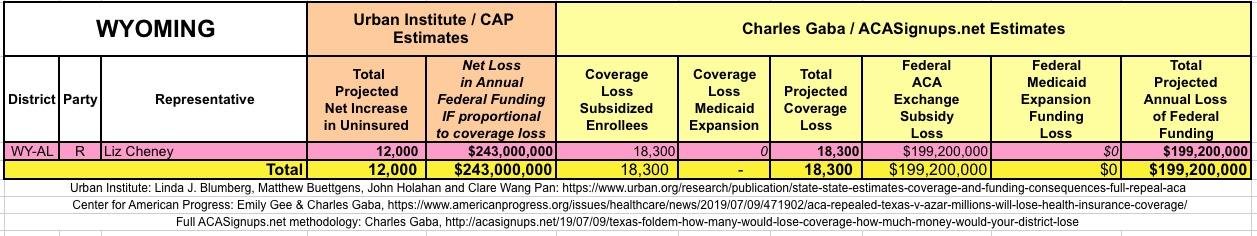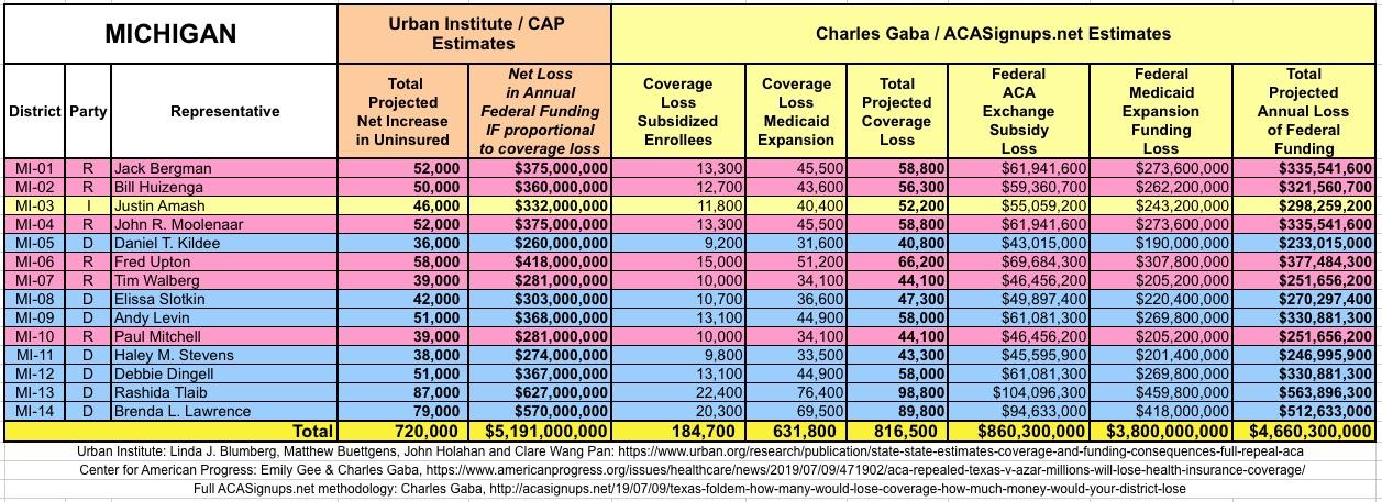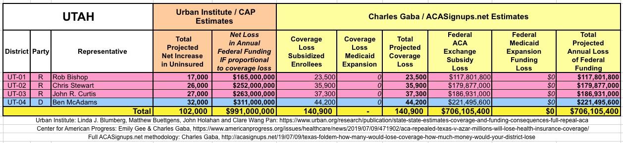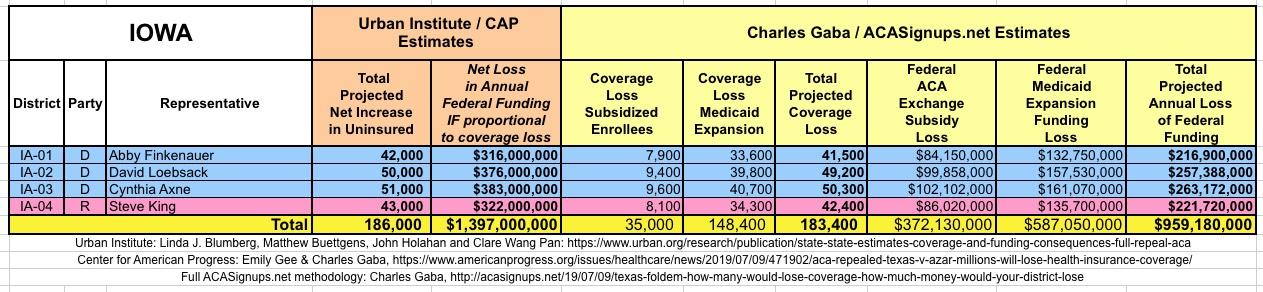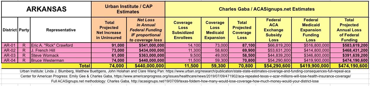 The Urban/CAP numbers are probably more accurate, but mine have one advantage: I've broken out both the coverage losses and funding losses by category (Individual Exchange Market/BHP and Medicaid Expansion). In addition, I've color-coded the Congressional Districts by which party each U.S. Representative is a member of.