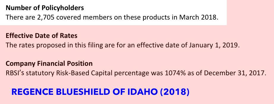 Idaho's DOI does a nice job of breaking out the rate h ikes by metal level, and the addition of the prior years' premiums/claims is a nice touch. Unfortunately, while they do include links to the filing summaries, one of them is missing (Regence BlueShield), and the one for Blue Cross doesn't give a hard enrollment number, making it difficult to plug in the relative market share for each carrier. For now I'm using the 2018 enrollment numbers for these two in the hope that their enrollment numbers stayed relatively stable (Idaho's exchange enrollment was virtually unchanged year over year, for instance).