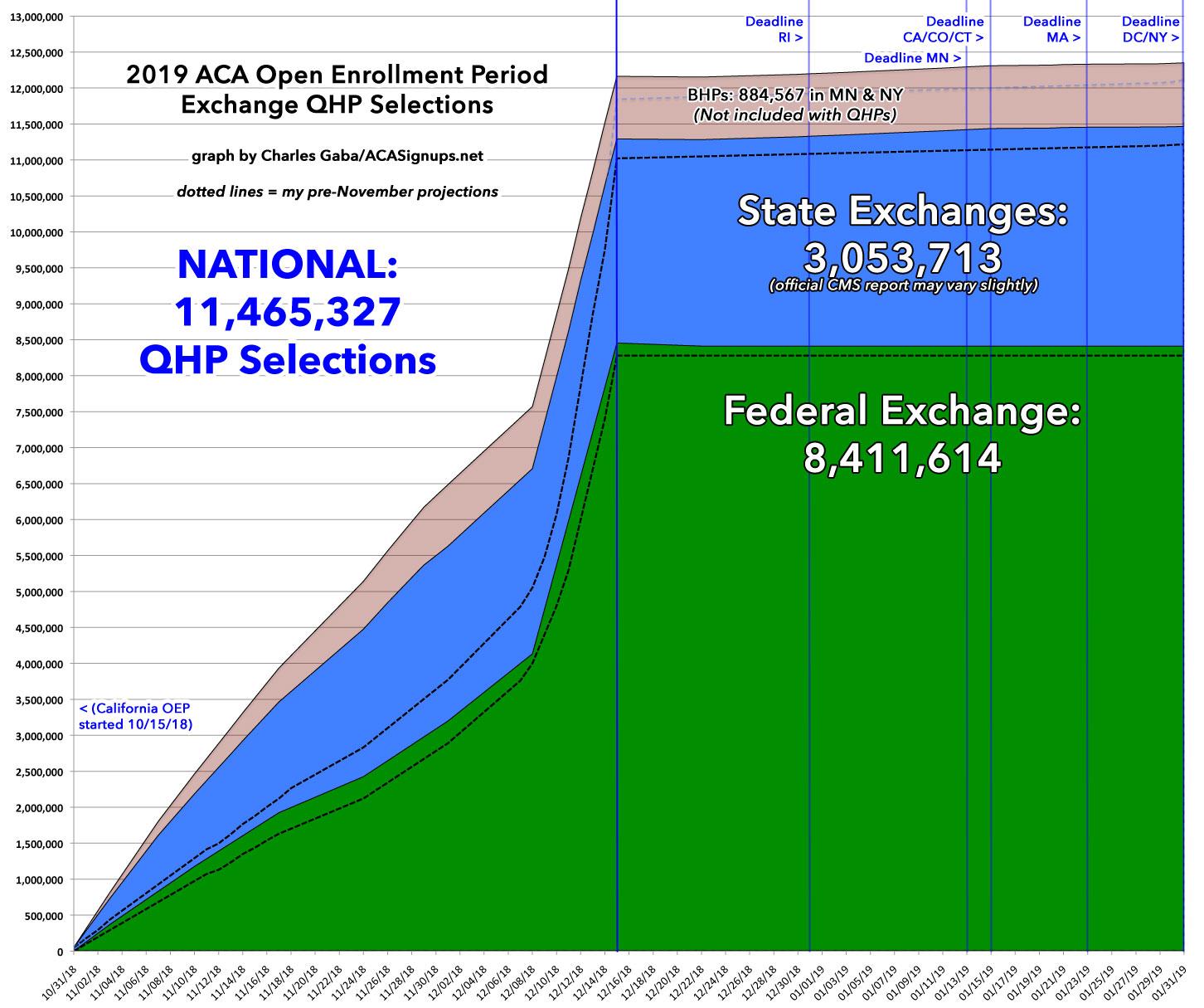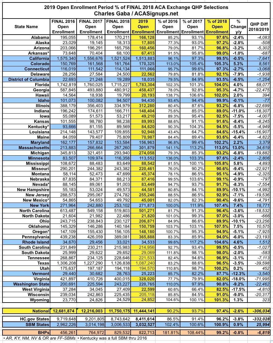 Two weeks ago, I posted a semi-final state-by-state 2019 Open Enrollment Period breakout which had the total at 11,430,438 QHP selections nationally.