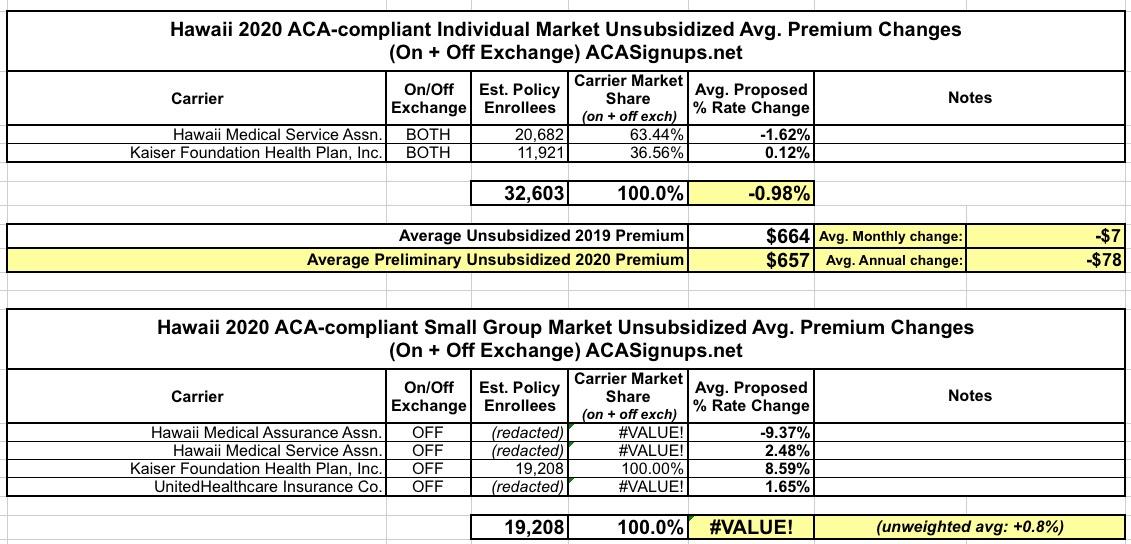 Hawaii: *Preliminary* avg. 2020 #ACA premium changes: 1.0% rate drop