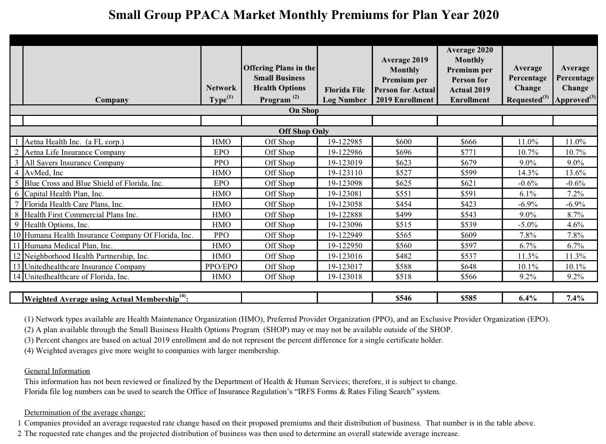 TALLAHASSEE, Fla. – The Florida Office of Insurance Regulation (OIR) announced today that premiums for Florida individual major medical plans in compliance with the federal Patient Protection & Affordable Care Act (PPACA) have been approved. Following OIR’s rate filing review, the average state-wide approved rate change on the Exchange is 0.0 percent beginning January 1, 2020.