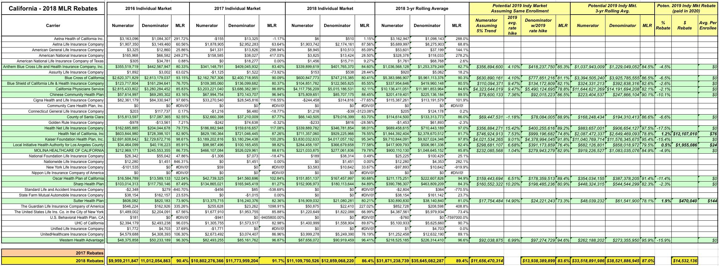 As for next year, I'd keep an eye on Health Net and L.A. County, where they're likely to see at least a few million in 2019 MLR rebates (potentially up to $14 million statewide):