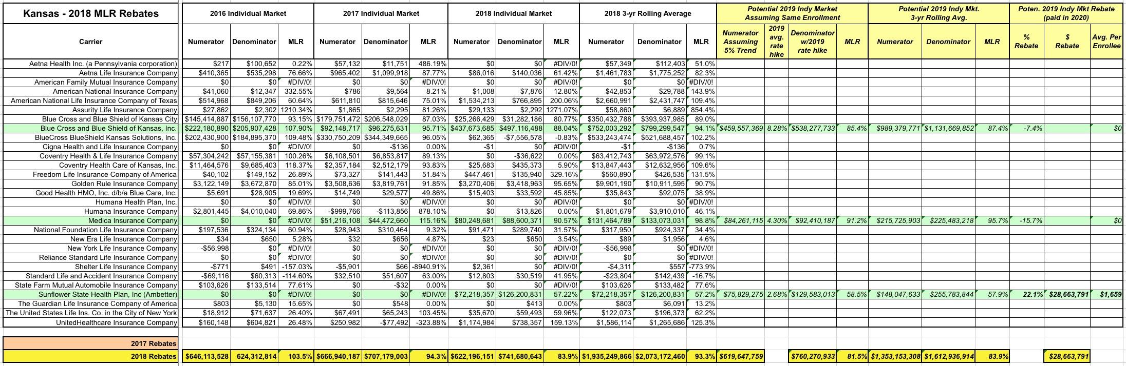 Kansas: If my data is accurate, 17,000 Sunflower State enrollees should be getting MLR rebate checks averaging $1,500 apiece!