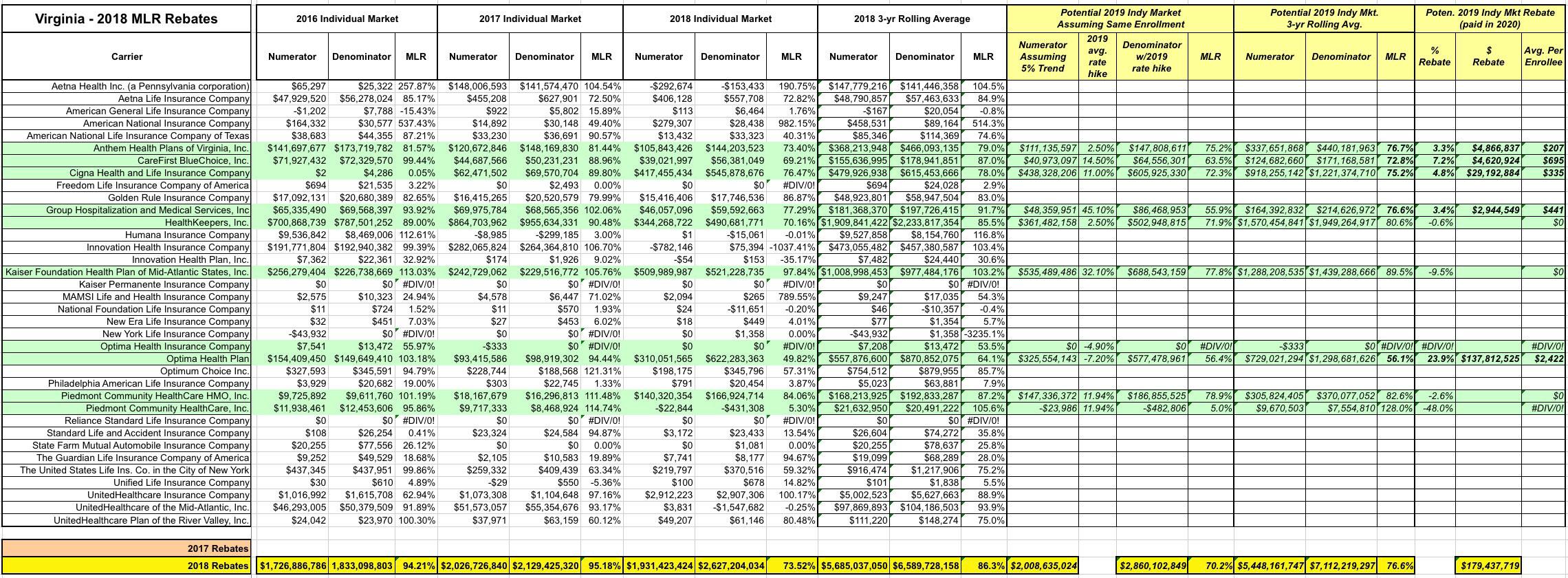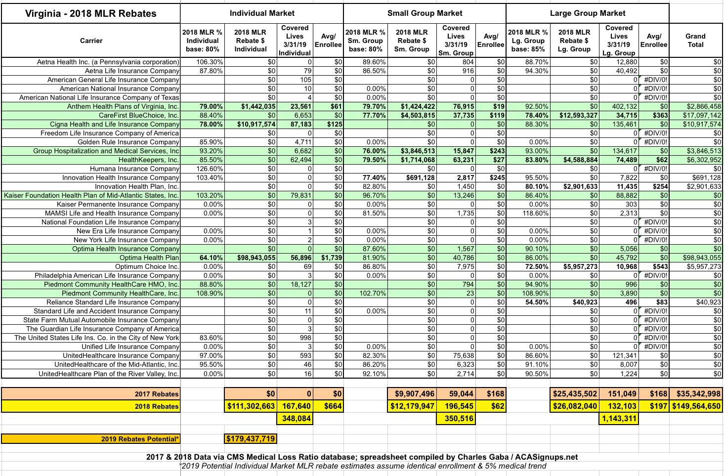Throw in another $12 million plus from other carriers and Virginia carriers are rebating over $111 million to their Individual Market enrollees this year. Then you have to include the Small and Large Group markets, for a grand total of a stunning $149.5 million in MLR rebates from Virginia alone.