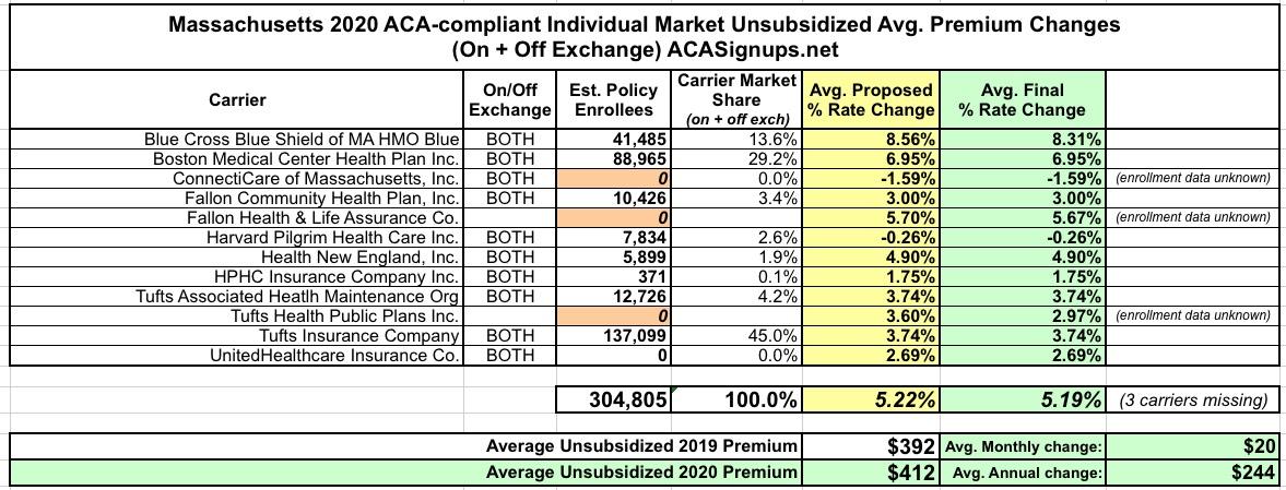Massachusetts: *Final* avg. unsubsidized 2020 premiums: 5.2% increase*