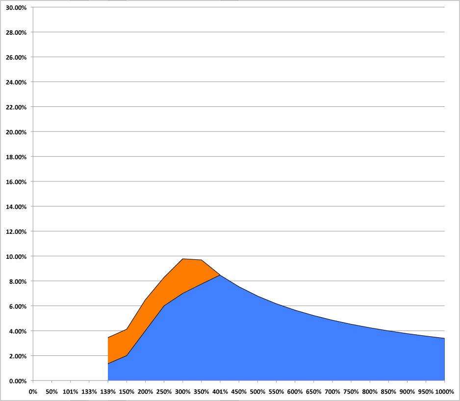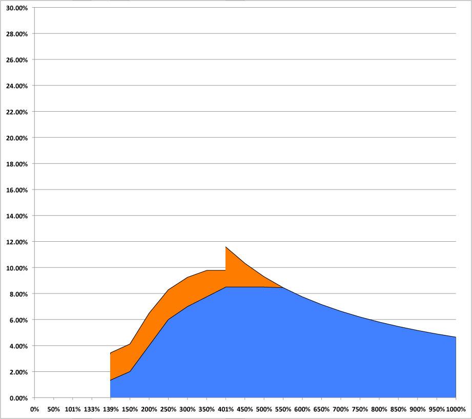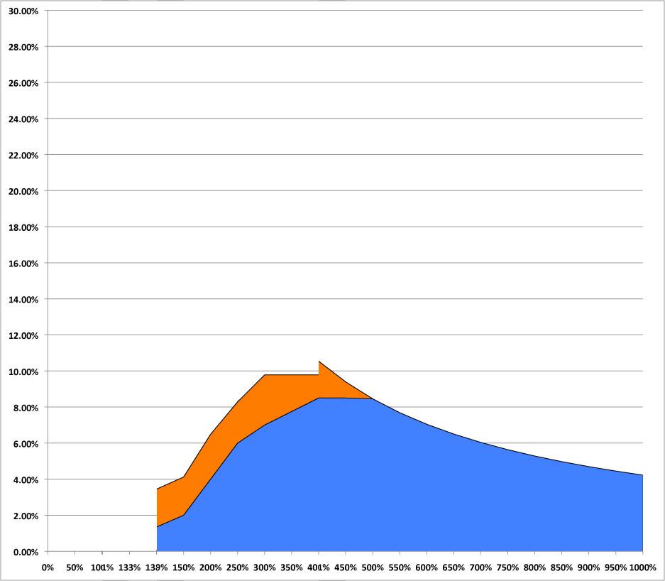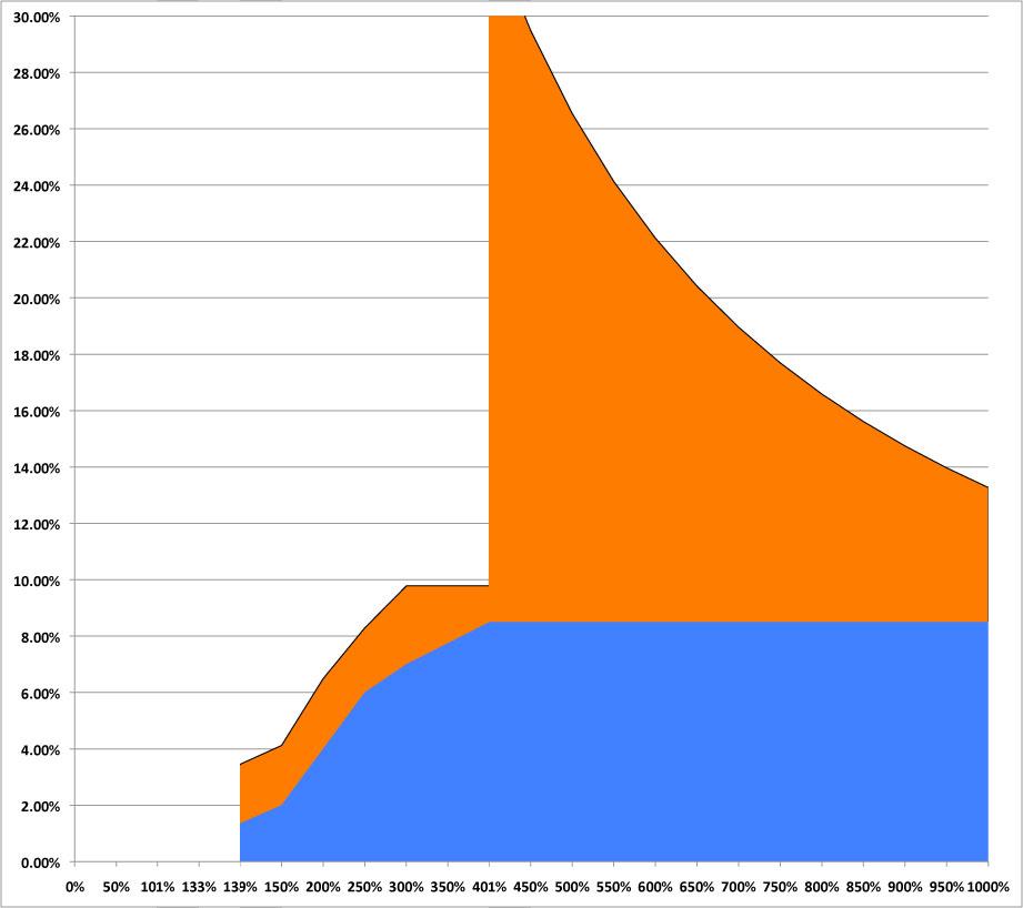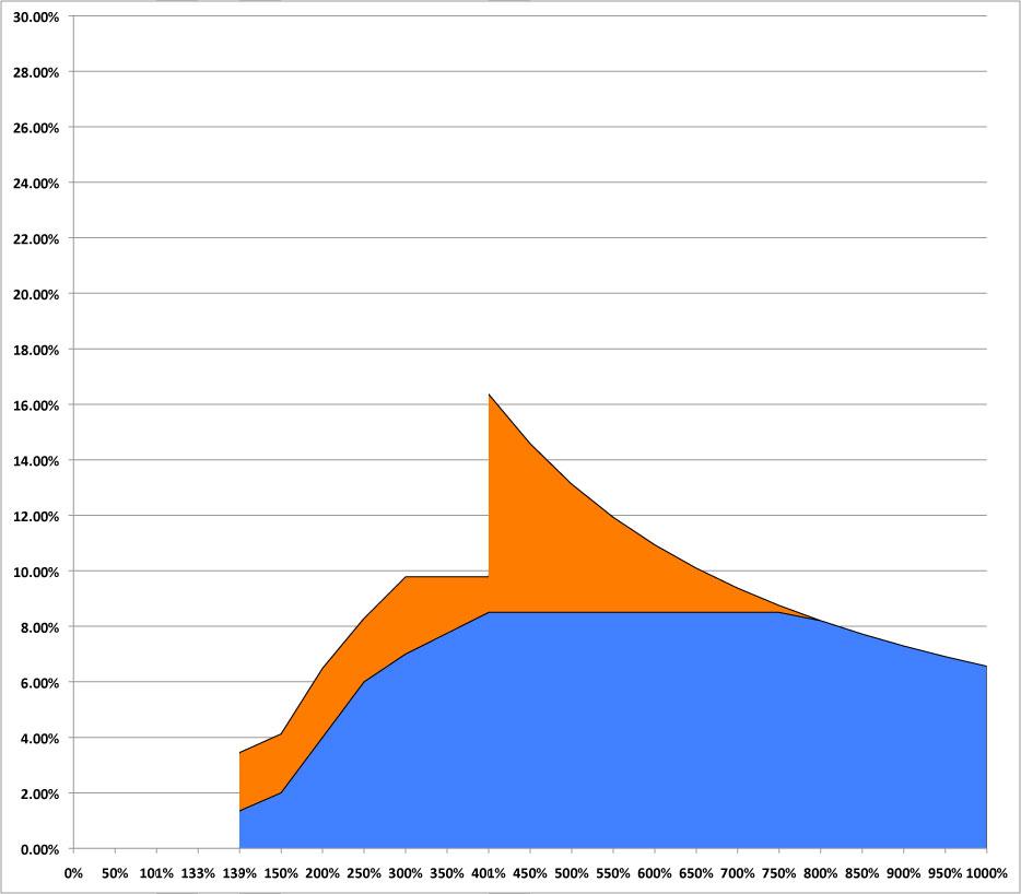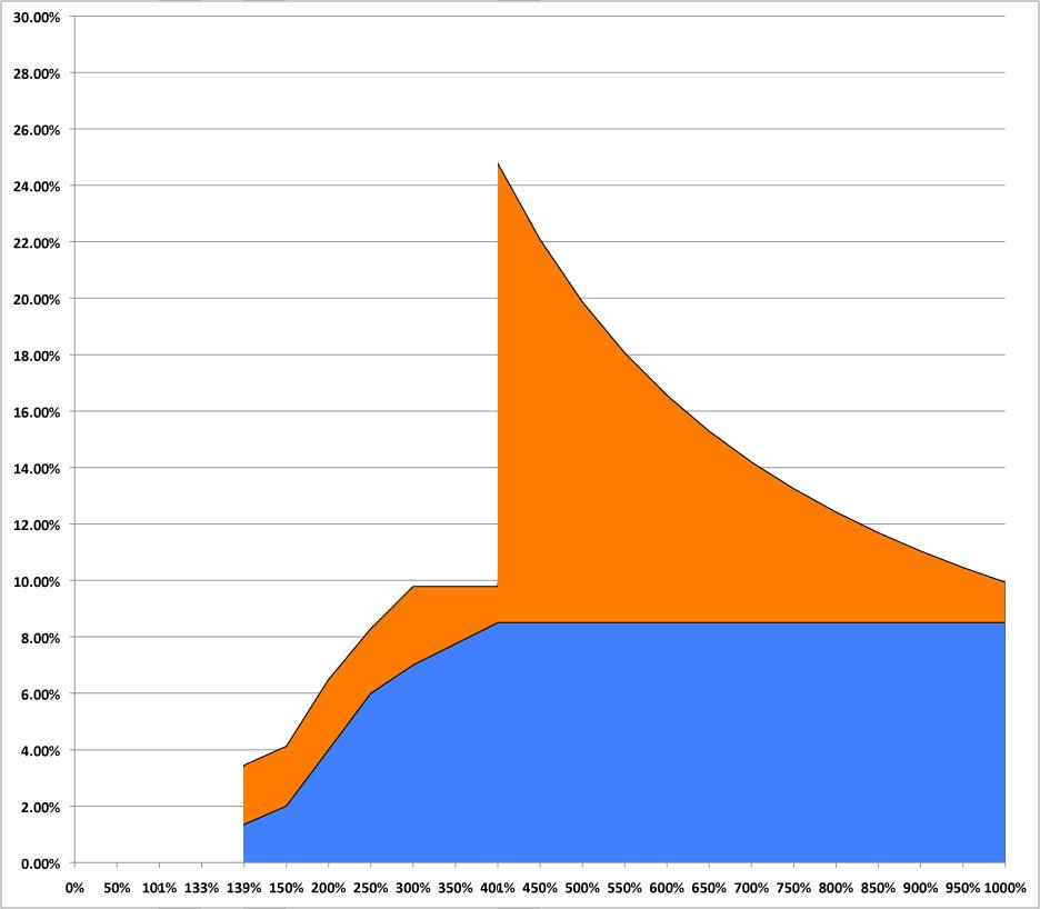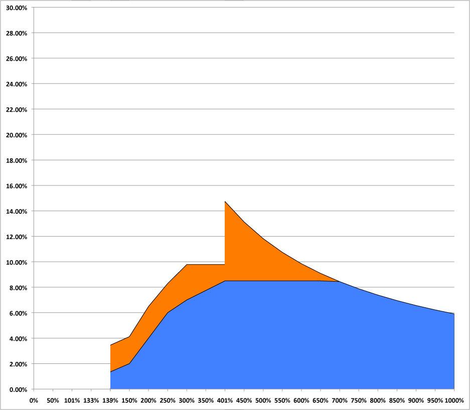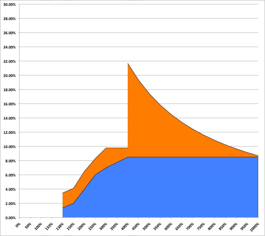 The savings for all of the single-person household would max out at just over $1,000/year regardless of their age...but as you can see, the older the enrollee, the more of a difference it makes as you move up the income scale. Thanks to the 8.5% cap (vs. 9.8%), those hovering around 400% and just over it can also save up to $1,000/year