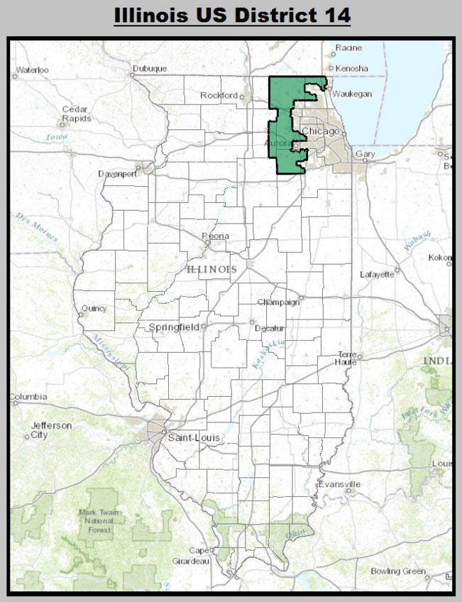 Illinois' 14th Congressional District, IL-14, covers the north & western suburbs of Chicago. Rep. Underwood lives in Naperville, Illinois, spanning both DuPage and Will Counties.