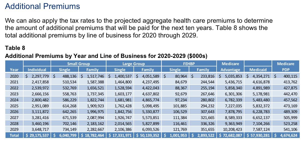 First of all, just how much money are we talking about here? Well, the formula gets a little wonky, but this analysis from Oliver Wyman projected the following (assuming the tax wasn't repealed and was actually collected each year going forward, of course):