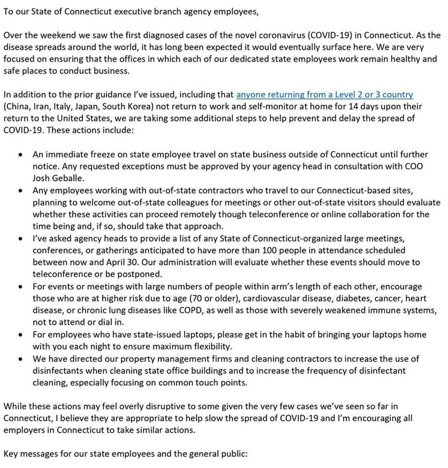 This morning I sent the following email to all State of Connecticut executive branch agency employees announcing the implementation of some actions in our offices that will significantly and proactively escalate measures to prevent the spread of #coronavirus.