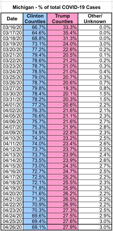 Of course, there are hundreds of thousands of Trump voters who live in those Clinton counties (800,000, to be precise), and nearly a million Clinton voters who live in the other 75 Trump-voting counties, and the virus doesn't care which party you belong to. Therefore, another important way of looking at this is by actual geography...specifically, the "Why should we have to suffer out here in the "heartland"? Coronavirus is a Detroit problem!" mantra being tossed around by certain (ahem) rural Michigan residents, among others.