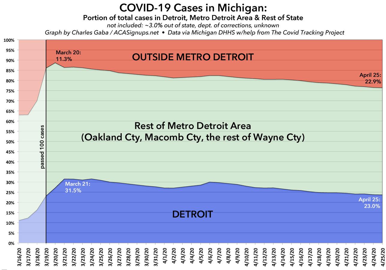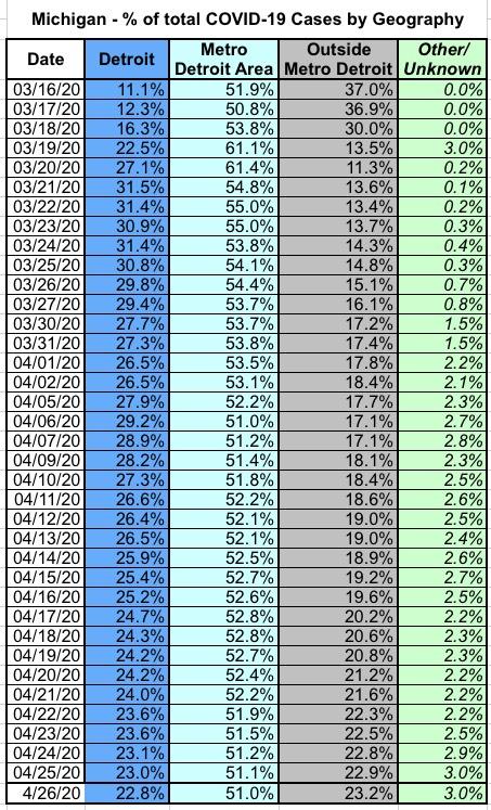 The trend is gradual but inevitable. round March 21st, Detroit was home to nearly 1/3 of all known Michigan COVID-19 cases, while "Not Detroit" (the other 80 counties outside of Wayne/Oakland/Macomb) only had 11.3% of all known cases...but since then, as the disease has spread and testing has ramped up, the tables have gradually turned: Just over 1 month later, Detroit is down to 23% of all cases statewide...while "Not Detroit" has more than doubled its share to 22.9%. Put another way, the ratio of COVID-19 cases has gone from Detroit having 3x as many as "NotDetroit" to a 1:1 ratio.