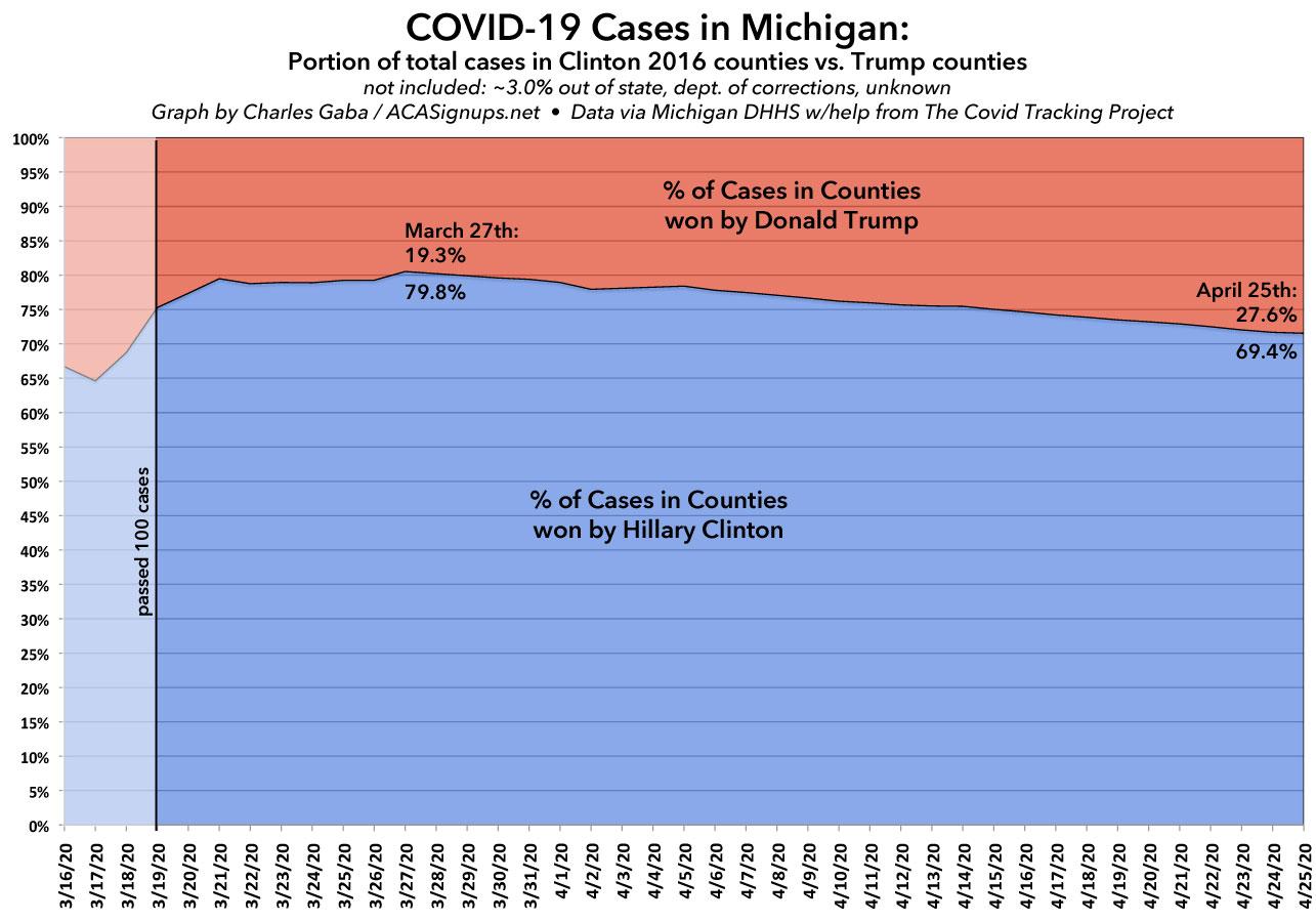 The graphs below aren't really relevant until March 19th, which is the day when confirmed cases broke 100 Michiganders (the official count actually jumped from 80 to 334 that day).
