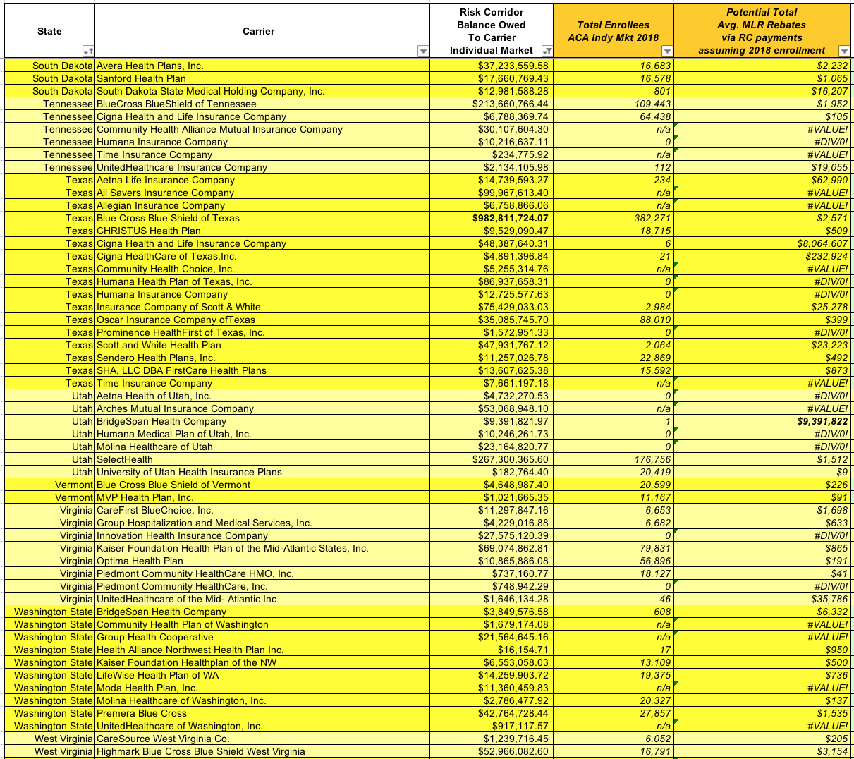 - Fifth: Some of the carriers which are owed RC payments don't exist any longer! Over a dozen non-profit co-ops went belly up in late 2015 (many in large part due to them being stiffed by the feds, I should note!), as did a few other small private carriers, such as WIN Health out of Wyoming. Any money owed to them will instead presumably go to their creditors or whatever hedge fund bought out their debt or whatever. Others may have since been bought out or merged with a larger carrier...which could mean the RC payments go to them instead (and could still potentially have to be paid out as MLR rebates, just by a different insurance company).