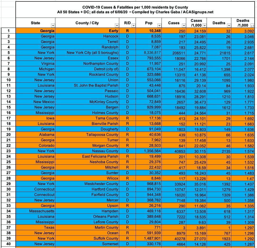 Here's the top 40 counties ranked by per capita COVID-19 fatalities as of Saturday, June 6th: