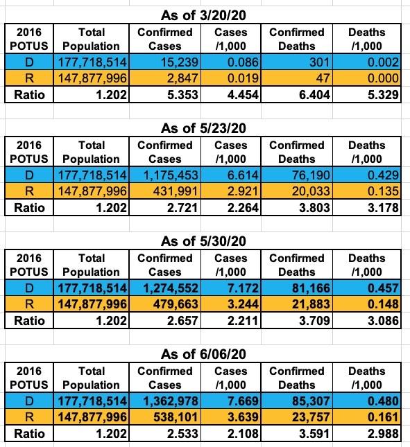 Assuming this trend continues, at some point (likely around Labor Day), there will be just as many cases per capita in red counties as in blue counties nationally, and blue counties will have only twice as high a rate of COVID-19 deaths. How this will impact the politics, policy and rhetoric in both Dem and GOP-run states will be impacted by how this trend plays out.