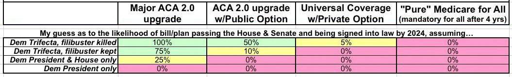 That was then; this is now. In January 2021, the U.S. will either still be in the middle of the pandemic (I hope not) or, at best, will be in the midst of recovering from it. EIther way, if the Democrats have a full trifecta (control of the White House, U.S. House of Representatives and U.S. Senate), I'd put the odds of each of these at more like this: