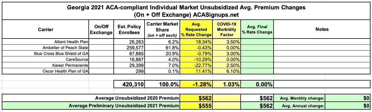 Georgia: Preliminary avg. 2021 #ACA premiums: -1.3% indy market, +11.1% sm. group