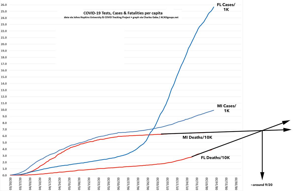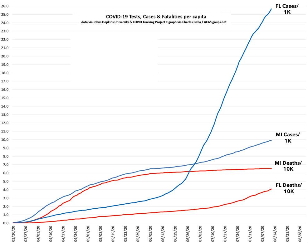 As you can see, while COVID-19 cases are now far higher per capita in Florida than in Michigan, deaths per capita are still considerably higher in Michigan...so far.