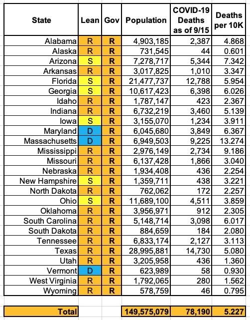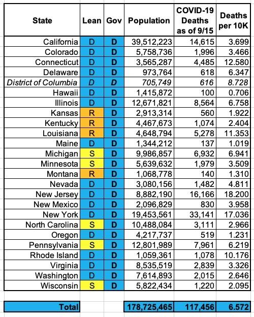I don't have the historic data to run a graph over time, but here's what the "Blue State/Red State" COVID-19 death rates look like as of mid-September using this definition:
