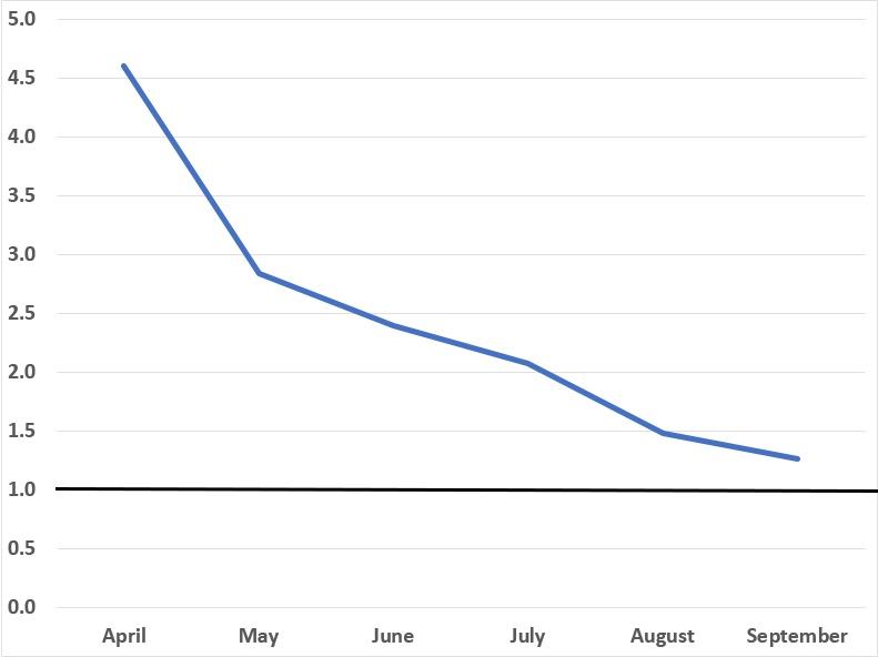 And yes, that's closing very quickly. Again, I don't have the data for every day using this criteria, but I do have the 15th of each month, so I whipped up another quickie graph: