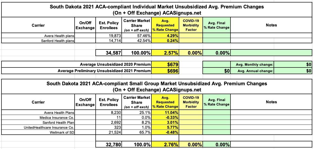 South Dakota: Preliminary avg. 2021 #ACA premium changes: +2.6% individual market; +2.8% sm. group