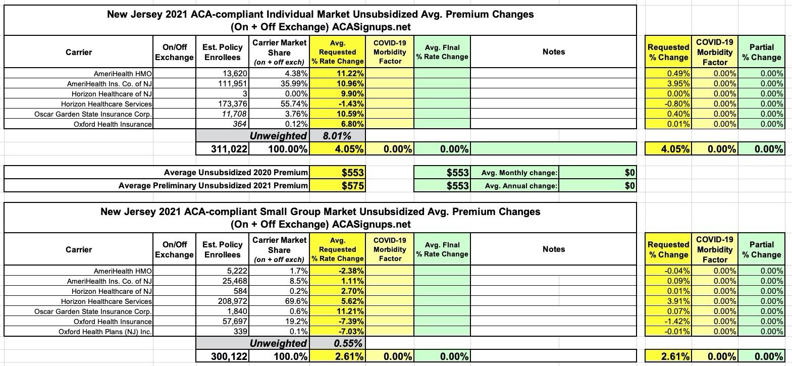 New Jersey: Preliminary avg. 2021 #ACA premiums: +4.1% individual market, +2.6% sm. group
