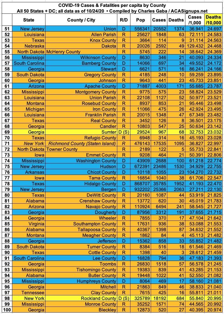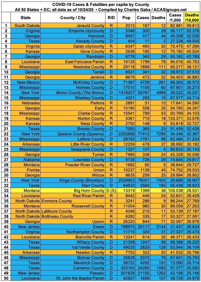 Here's the top 100 counties ranked by per capita COVID-19 fatalities as of Saturday, October 31st (click image for high-res version):