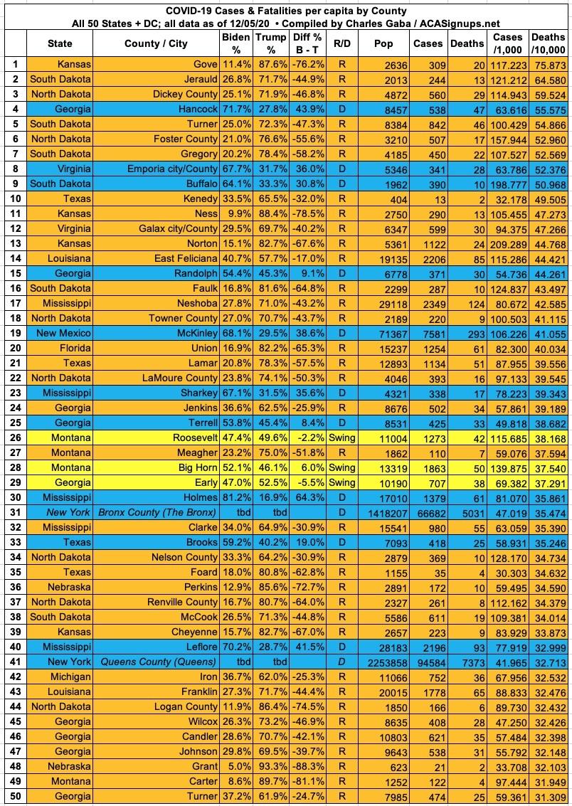 Here's the top 100 counties ranked by per capita COVID-19 fatalities as of Saturday, December 5th (click image for high-res version):