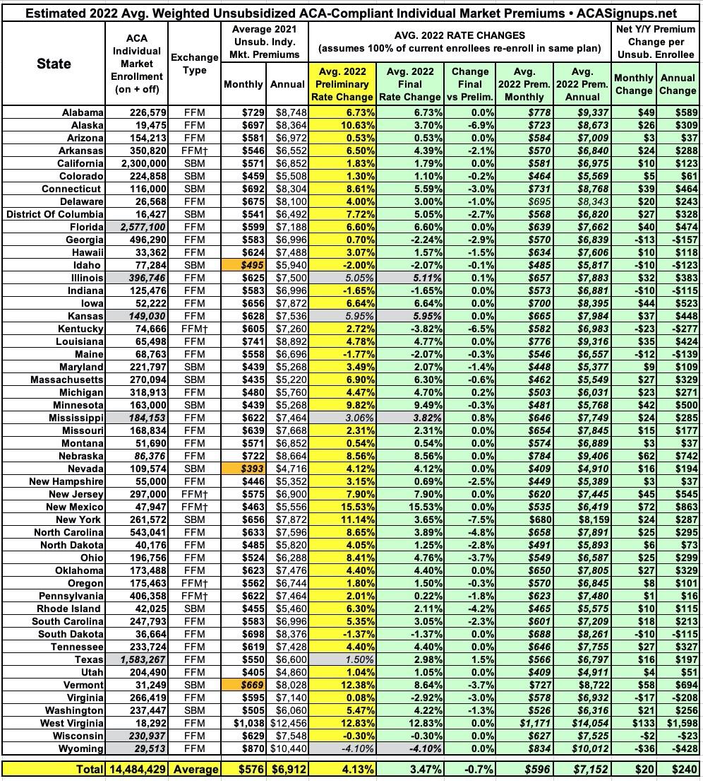UPDATE 10/27/21: Added approved rate changes for Ohio, Tennessee, South Dakota, North Carolina & Arkansas, along with some updates/corrections to enrollment data & carrier participation for a few other states. Also revised estimated total market enrollment for the 7 states which I don't have hard data available for.