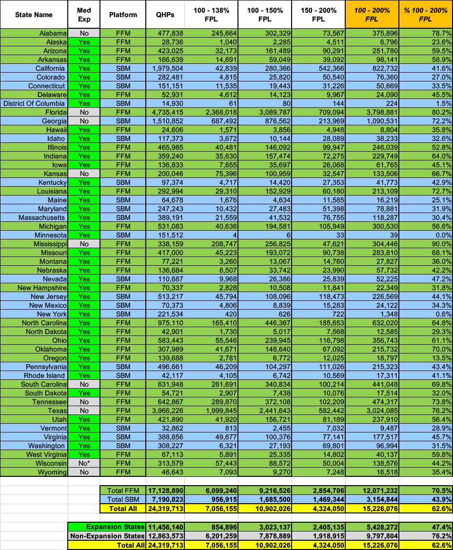 That's over 15.2 million people total, and with extremely rare exceptions, just about every one of them should be enrolled in a Silver CSR plan, aka "Secret Platinum", since the extremely generous Cost Sharing Reduction (CSR) assistance in the 100 - 200% FPL range turns Silver plans (which normally have a ~70% Actuarial Value) into either an 87% or 94% AV plan...effectively Platinum (90% AV)).