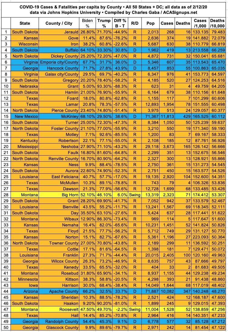 Here's the top 100 counties ranked by per capita COVID-19 fatalities as of Friday, February 12th, 2021 (click image for high-res version):