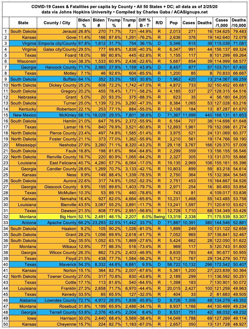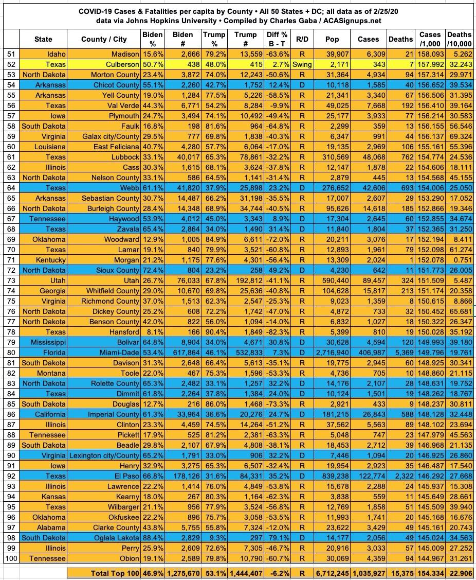 Here's the top 100 counties ranked by per capita COVID-19 fatalities as of Thursday, February 25th, 2021 (click image for high-res version):