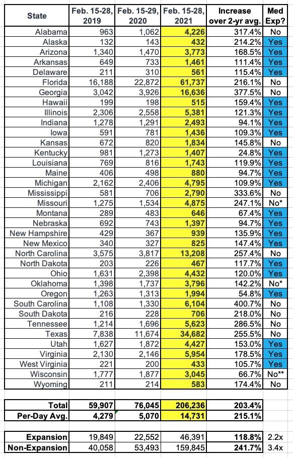 Here's the state-by-state breakout. I've included a column which compares the first 2 weeks of the COVID SEP against the average 2-week SEP enrollment from 2019 and 2020. Sure enough, it comes in at over 3x the daily average vsthe two prior years: