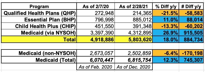 First, instead of measuring enrollment as of January 31st of each year, they're comparing enrollment as of the end of February 2021 against February 7th 2020. This gets into a bit of a weird area, because last year they tacked on an extra week for no particular reason (COVID hadn't hit yet), while this year, due to the COVID-19 pandemic, the "official deadline" for 2021 technically hasn't ended yet. NYSOH announced back on 1/21 that they were extending Open Enrollment through March, and later on they announced they were matching the federal COVID Enrollment Period which runs through May 15th.