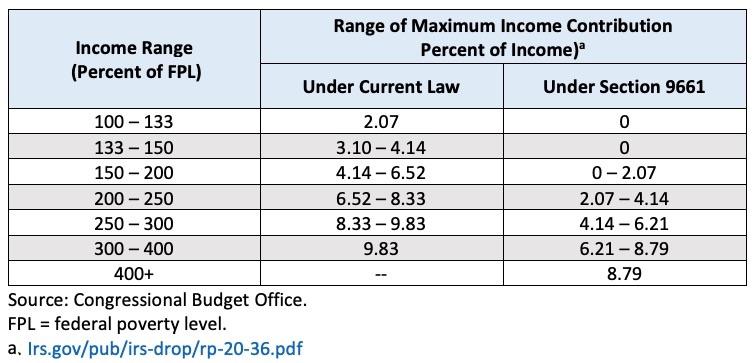 Section 9661 would increase premium tax credits for most currently eligible people and expand eligibility to people with incomes greater than 400 percent of the FPL through the end of 2022. For 2021, the legislation would modify the subsidy structure under current law, as detailed in Exhibit 1.