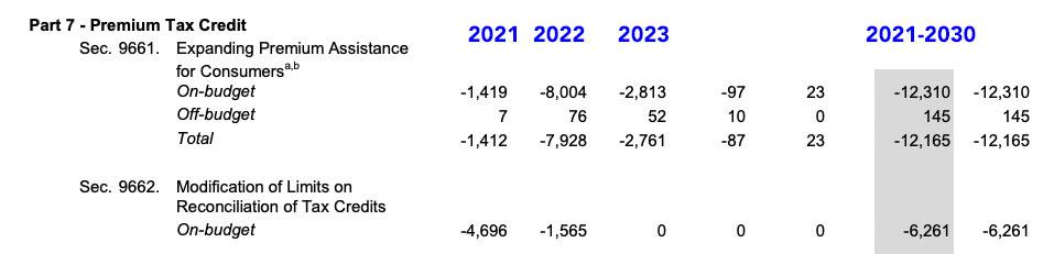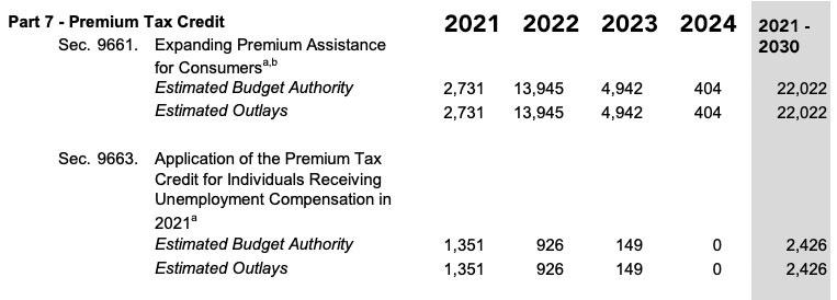 It's important to note that only the $22 billion portion of this could be reasonably used to get an idea of how much eliminating the Subsidy Cliff & beefing up the APTC levels would actually cost on a regular basis; the "reduction in revenues" portion mostly refers to COVID-era provisions like waiving federal clawback of excessive APTC subsidies from 2020 and treating exchange enrollees who filed for unemployment this year as only earning 133% FPL even if they actually earned more than that.