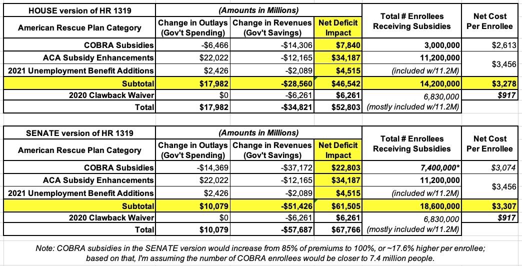 As for the SENATE version of the American Rescue Plan (the version which was actually signed into law), that did include one significant change in the COBRA section: Instead of subsidizing 85% of premiums for COBRA enrollees for six months, it subsidizes 100% of them. On the surface, you'd think this would only increase the cost from $7.8 billion to $9.2 billion for the 3.0 million COBRA enrollees in question, but of course not having to pay a dime in premiums has a much bigger incentive for more laid-off folks to sign up for COBRA as well.