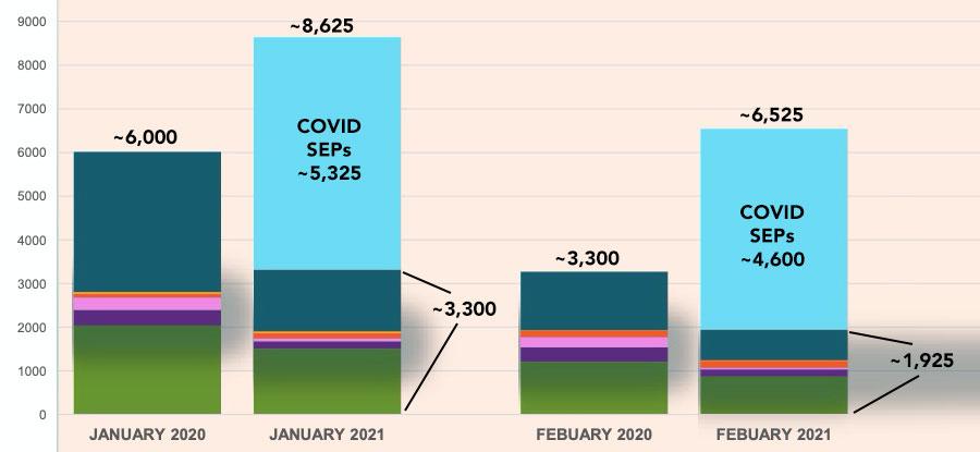 As far as I can tell, in January and February 2021, they're averaging around 63% more total SEP enrollments than they did for the first two months of 2020 (the light blue represents COVID SEP enrollments; the other colors represent other reasons people qualified, like getting married, losing their job, moving, etc):