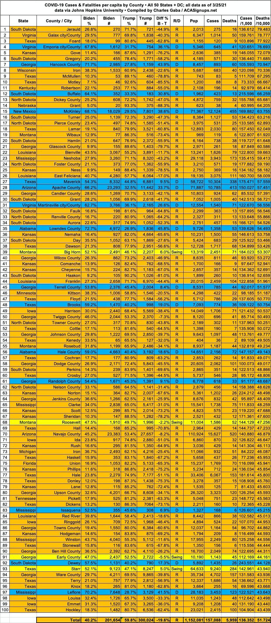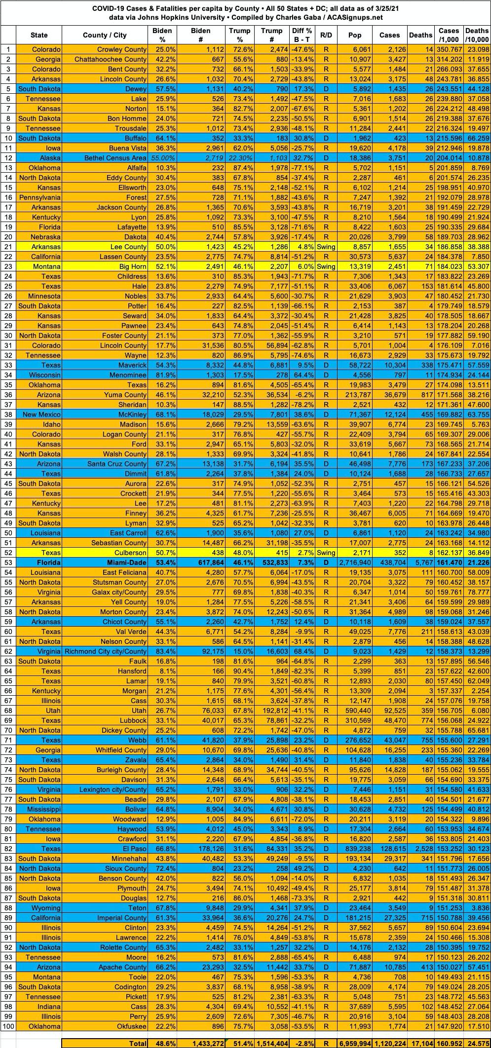 Here's the top 100 counties ranked by per capita COVID-19 fatalities as of Thursday, March 18th, 2021 (click image for high-res version):