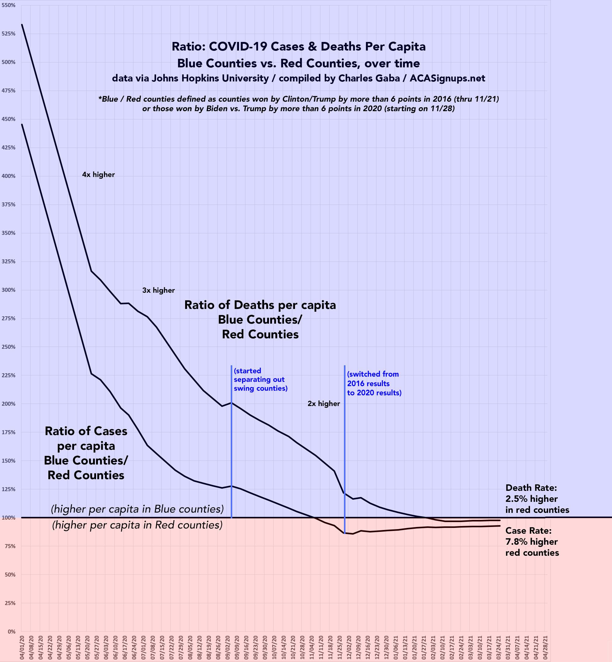 It's also worth noting how the ratio of per capita cases and mortality have shifted between the Blue and Red-leaning counties over time.