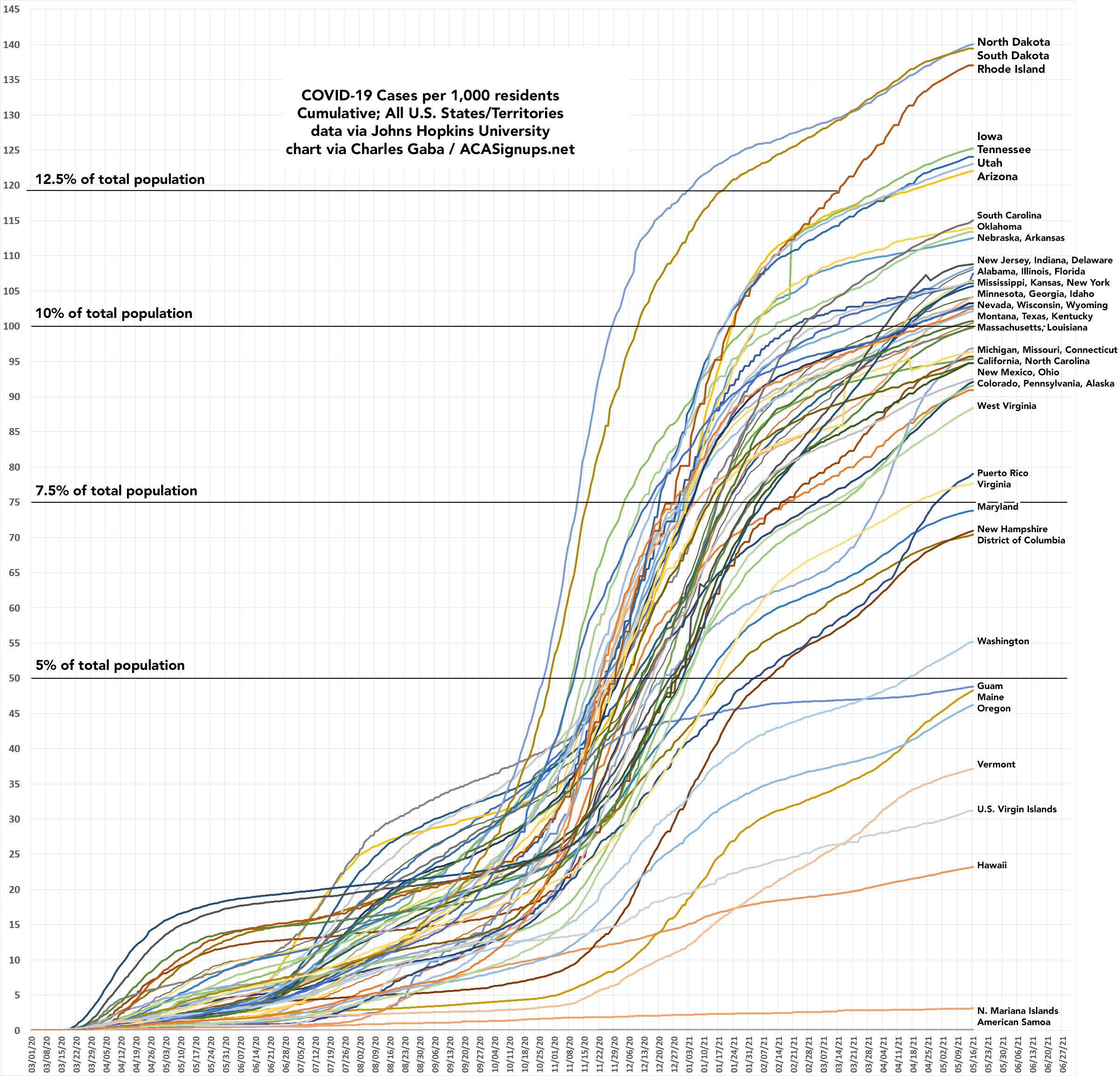Nearly 1 out of every 7 residents of North Dakota, South Dakota and Rhode Island have tested positive for COVID-19 to date.