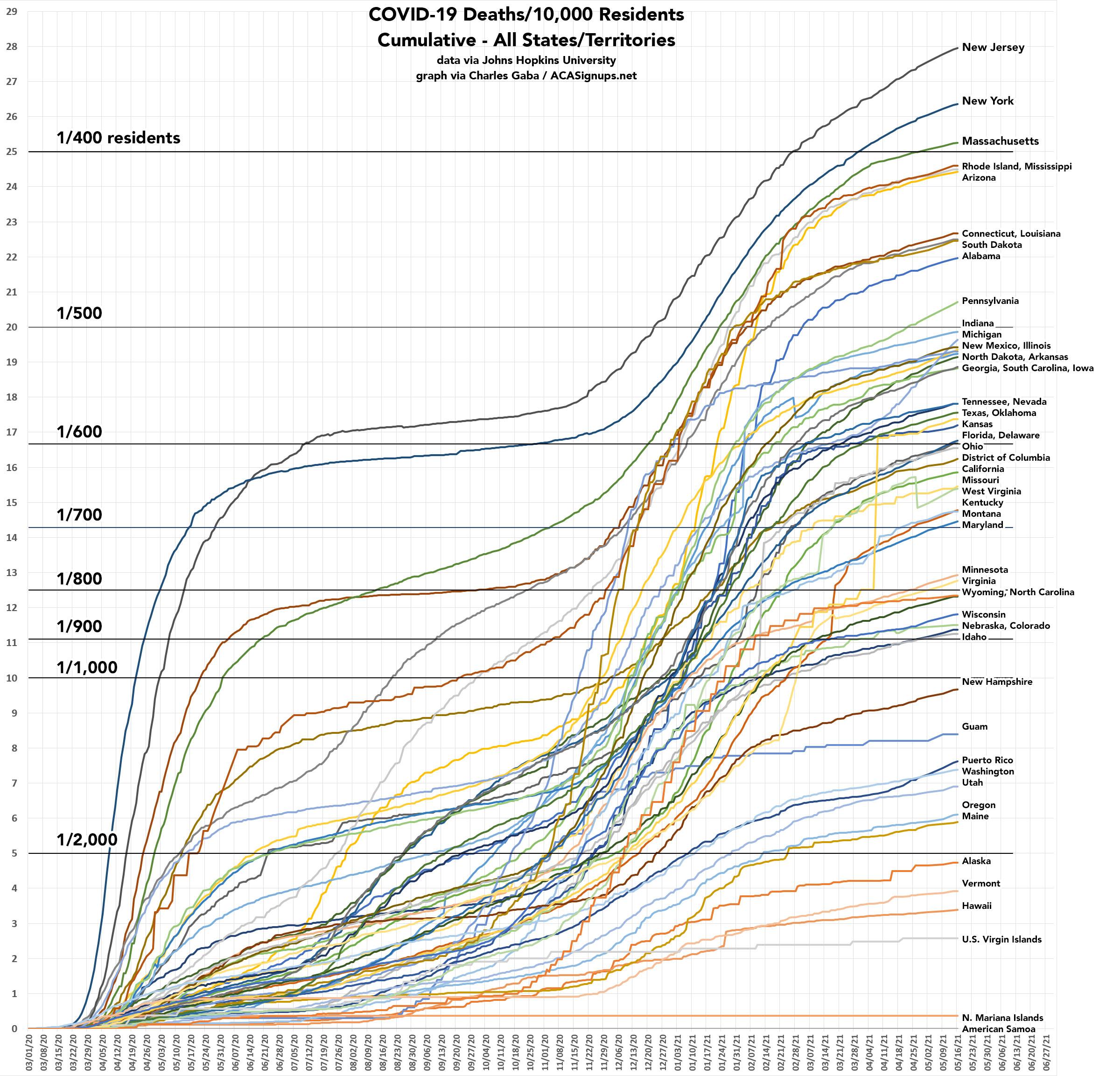 Next, let's look at the cumulative mortality rate for every U.S. state and territory. Here, New Jersey and New York are still worse than the rest of the country (primarily due to their mass deaths from March - May last spring)...but as you can see, several other states are, tragically, also catching up to them on this front as well.