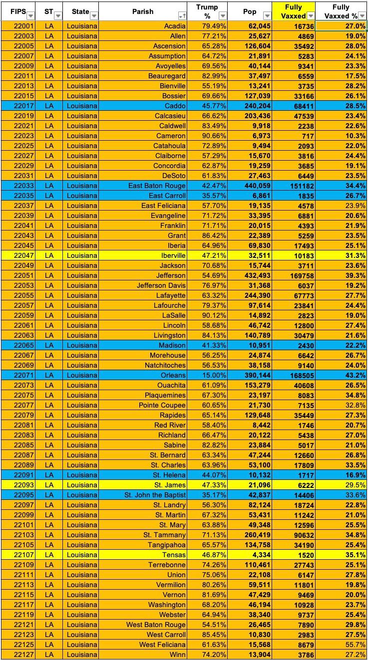 Louisiana: #COVID19 vaccination rates by parish & partisan lean