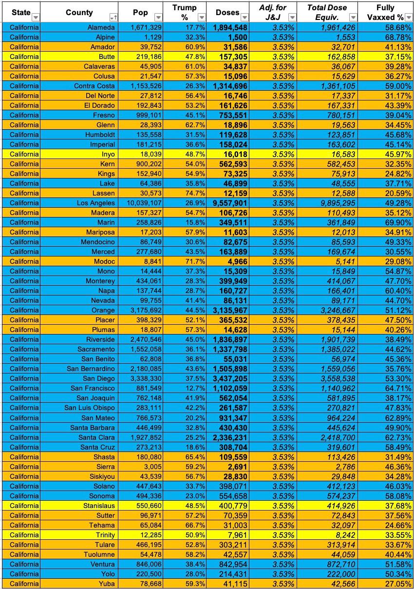 Now that I've developed a standardized format/layout & methodology for tracking both state- and county-level COVID vaccination levels by partisan lean (which can also be easily applied to other variables like education level, median income, population density, ethnicity, etc), I've started moving beyond my home state of Michigan. Here's California, and it's pretty eye-opening.
