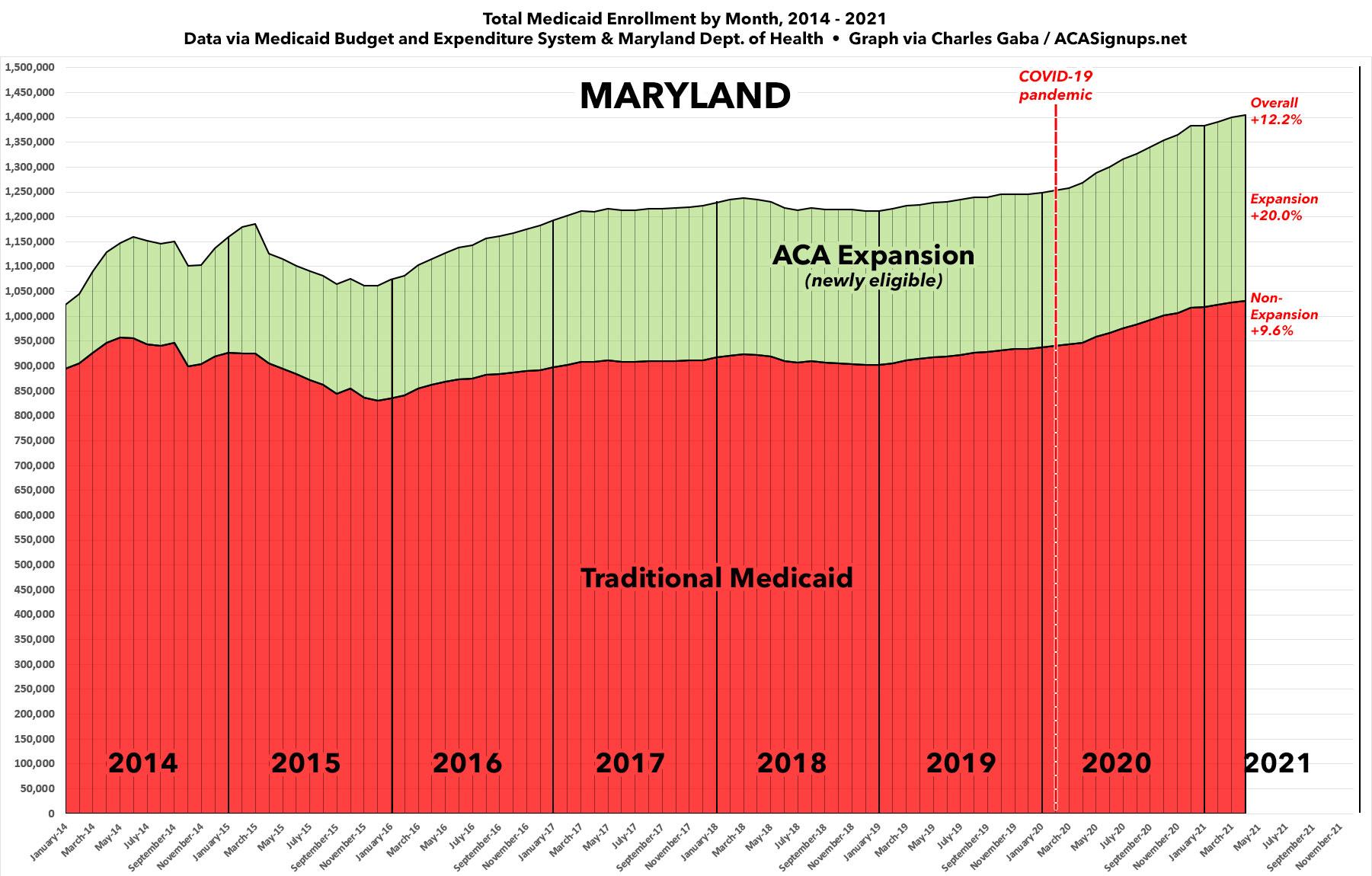 Total Medicaid enrollment in Maryland (including expansion) hovered around 1.2 million for a few years prior to the COVID pandemic hitting last February. Since then, enrollment in non-ACA Medicaid has increased 9.6% while ACA expansion enrollment has gone up by 20%, for an overall increase of 12.2% statewide.