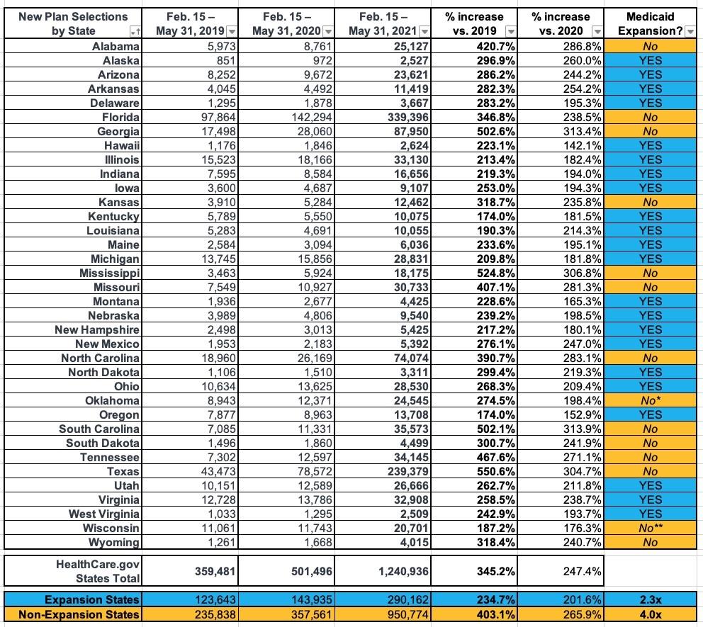 On average, states which have expanded Medicaid have seen SEP enrollment rates 2.3x higher than they were for the same time period in 2019, while non-expansion states are up more than 4x over 2019. The reason for this is the 100 - 138% FPL "overlap" population: In expansion states, those earning up to 138% FPL are shifted over to Medicaid instead, but in non-expansion states, those earning more than 100% FPL are eligible for $0 premium ACA exchange plans.
