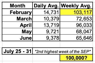 If so, that woudl be something like 10,000 per day from 7/01 - 7/24, or perhaps 240,000. Add the (apparent) ~100K from the final week of the month and you'd get roughly 340,000 for the full month of July.